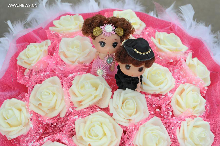 The photo shows a bunch of flowers sold at a flower stall in Zhengzhou, capital of central China's Henan Province, Feb. 13, 2014. As the Valentine's Day draws near, the supply of roses in south China is tight which caused the increased price of flowers. (Xinhua/Zhao Peng)