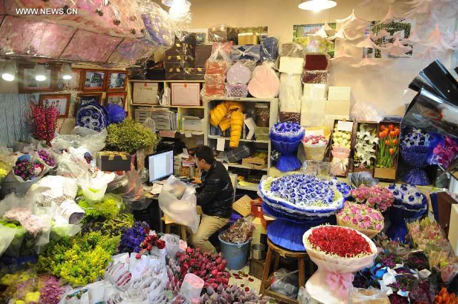 The photo shows a flower store which gets over 200 orders for each day online in Zhengzhou, capital of central China's Henan Province, Feb. 13, 2014. As the Valentine's Day draws near, the supply of roses in south China is tight which caused the increased price of flowers. (Xinhua/Zhao Peng)