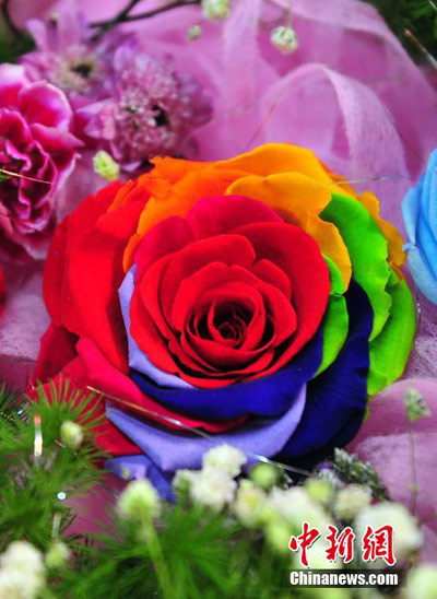 Rainbow roses become the star product for the forthcoming Valentine’s Day in flower shops in Shenyang, northeast China’s Liaoning province. (CNS Photo/ Yu Haiyang)