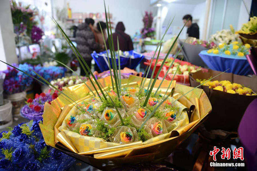 Rainbow roses become the star product for the forthcoming Valentine’s Day in flower shops in Shenyang, northeast China’s Liaoning province. (CNS Photo/ Yu Haiyang)