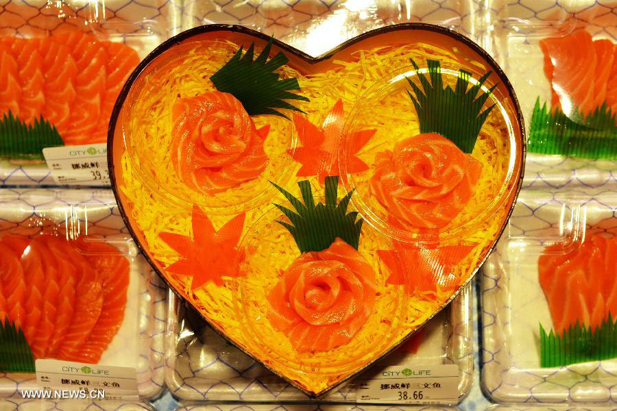 Photo taken on Feb. 13, 2014 shows roses made of salmon at a supermarket in Hangzhou, capital of east China's Zhejiang Province. (Xinhua/Long Wei)