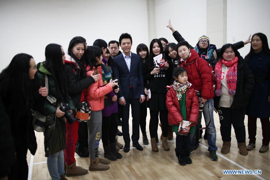 Photo taken on Dec. 31, 2013 shows Li Yundi (C) posing for a photo with his fans after his piano concert in Beijing, capital of China. Li, aiming at popularizing classic music, held more than 30 concerts across China in 2013. (Xinhua/Jin Liwang)