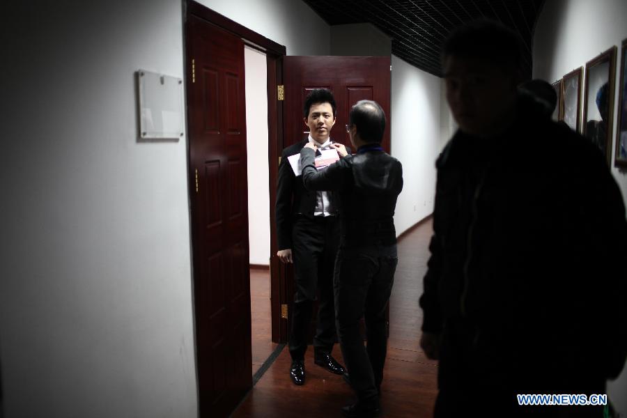 Photo taken on Dec. 31, 2013 shows Li Yundi (L) gets prepared for his piano concert in Beijing, capital of China. Li, aiming at popularizing classic music, held more than 30 concerts across China in 2013. (Xinhua/Jin Liwang)
