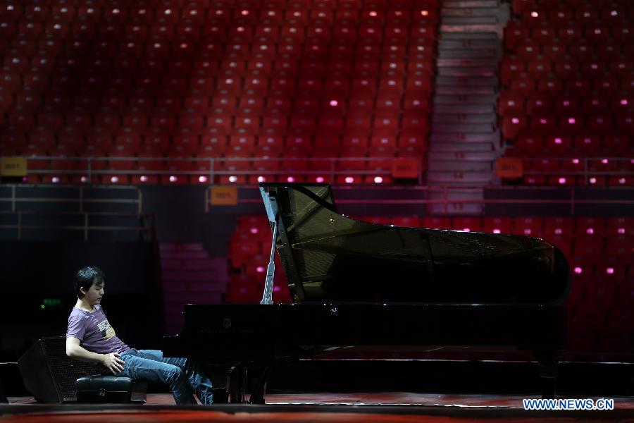 Photo taken on Dec. 31, 2013 shows Li Yundi pondering over acoustics during the last rehearsal for his piano concert in Beijing, capital of China. Li, aiming at popularizing classic music, held more than 30 concerts across China in 2013. (Xinhua/Jin Liwang)