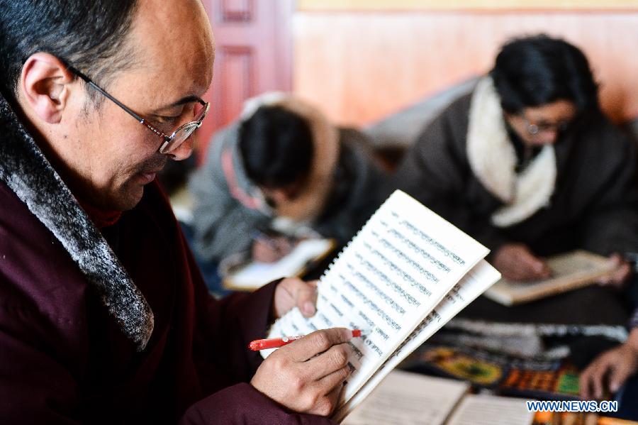 Aang Jiancuo, inheritor of De'ang Sazhi Tibetan Calligraphy, looks through assignment of students at a classroom in the De'ang Temple in Dari County of Tibetan Autonomous Prefecture of Golog, northwest China's Qinghai Province, Feb. 15, 2014.(Xinhua/Wu Gang)