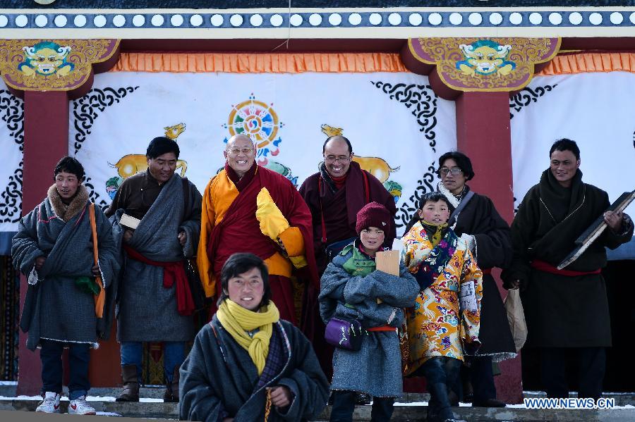 Aang Jiancuo (3rd R, rear), inheritor of De'ang Sazhi Tibetan Calligraphy, poses photos with his students in the De'ang Temple in Dari County of Tibetan Autonomous Prefecture of Golog, northwest China's Qinghai Province, Feb. 15, 2014.(Xinhua/Wu Gang)