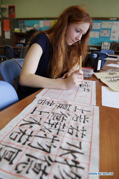 Junior high school student Alldredge Anika attends the 10th Chinese Bridge Chinese Proficiency Competition in San Francisco, the United States, on Feb. 15, 2014. (Xinhua/Liu Yilin)