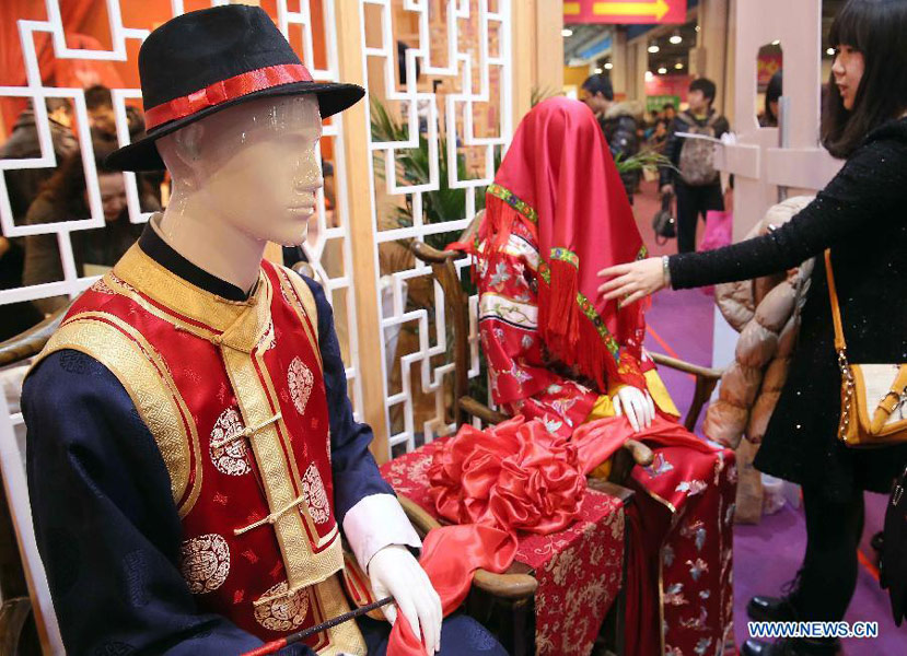A visitor looks at traditional Chinese wedding dress during a wedding expo in Beijing, capital of China, Feb. 15, 2014. The 2014 China Wedding Expo opened here on Sunday. (Xinhua/Chen Jiannan)