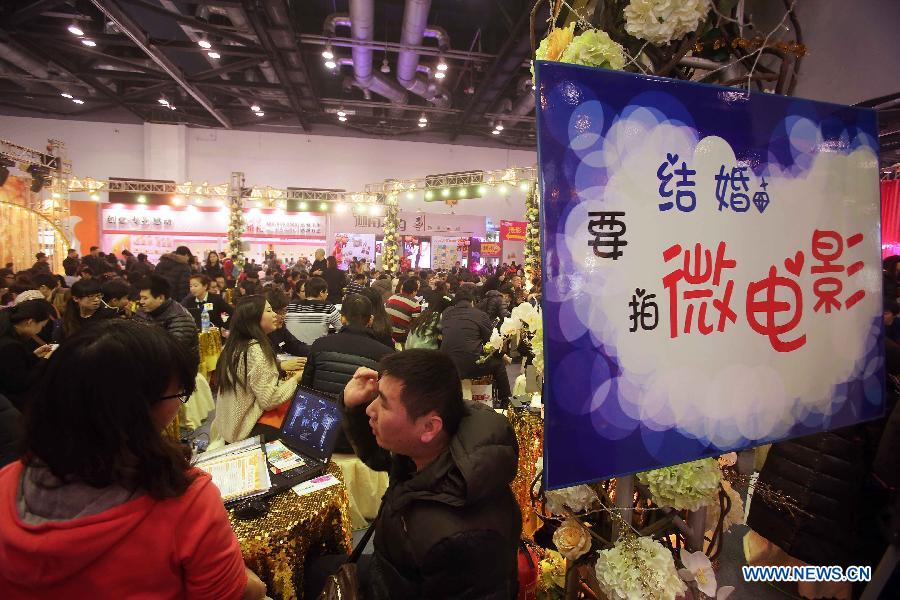 Visitors are seen at a wedding expo in Beijing, capital of China, Feb. 15, 2014. The 2014 China Wedding Expo opened here on Sunday. (Xinhua/Chen Jiannan)