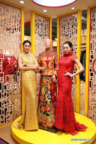 Models display traditional Chinese wedding dress during a wedding expo in Beijing, capital of China, Feb. 15, 2014. The 2014 China Wedding Expo opened here on Sunday. (Xinhua/Chen Jiannan)