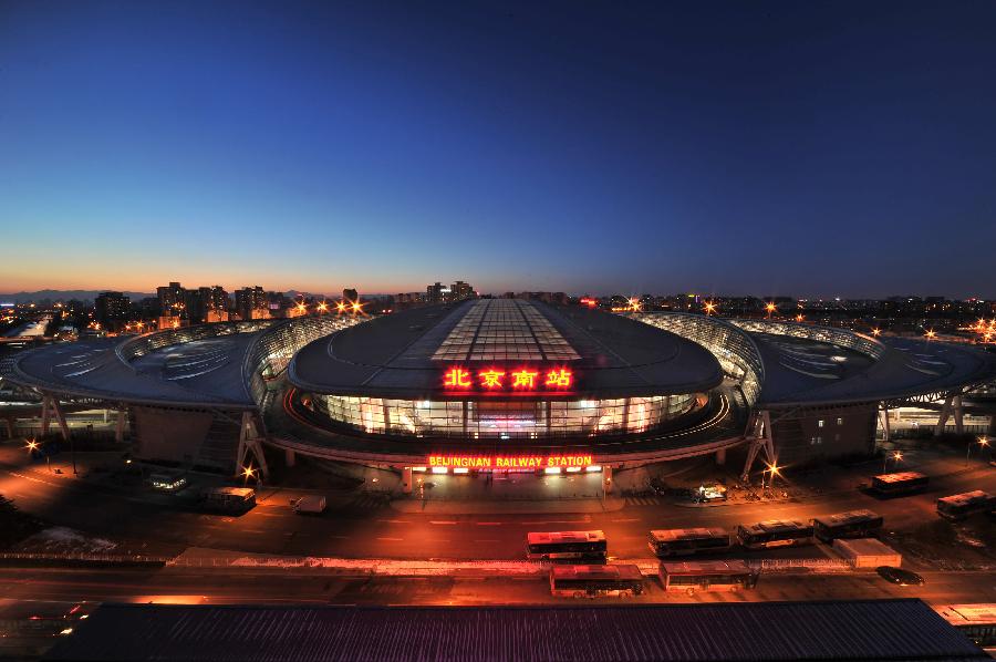 Photo taken on Feb. 9, 2014 shows the night view of Beijing South Railway Station in Beijing, China. The station replaced the old Beijing South Railway Station and was put into operation in its present form in 2008. The old station was in use from 1897 to 2006. [Photo: Xinhua]
