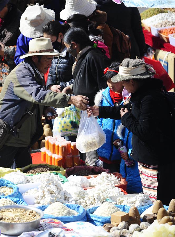 People purchase goods for the coming Tibetan losar or the Tibetan New Year at a bazaar in Lhasa, capital of southwest China's Tibet Autonomous Region, Feb. 19, 2014. People of the Tibetan ethnic group will embrace the "Wood Horse Losar" on March 2.(Xinhua/Liu Kun)