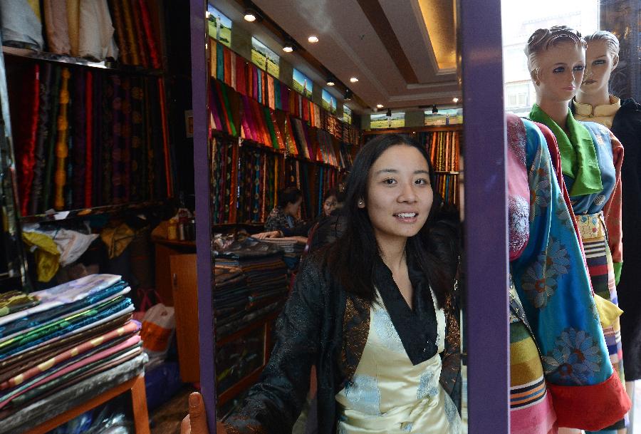 A girl tries on a costume of the Tibetan ethnic group for the coming Tibetan losar or the Tibetan New Year at a clothing shop in Lhasa, capital of southwest China's Tibet Autonomous Region, Feb. 19, 2014. People of the Tibetan ethnic group will embrace the "Wood Horse Losar" on March 2. (Xinhua/Chogo)