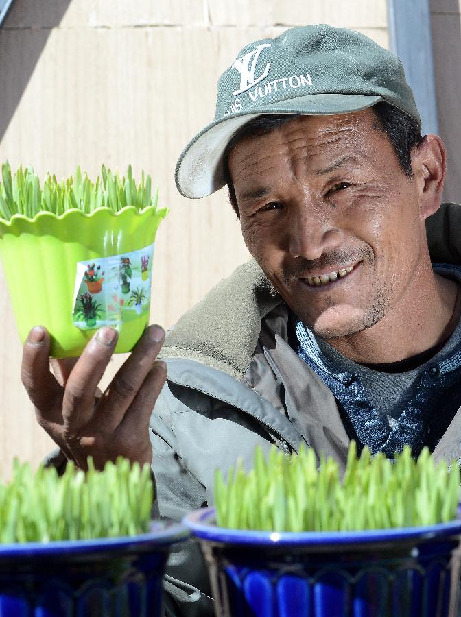 Farmer Dawa from the suburb of Lhasa sells barley seedlings before the coming Tibetan losar or the Tibetan New Year at a bazaar in Lhasa, capital of southwest China's Tibet Autonomous Region, Feb. 19, 2014. People of the Tibetan ethnic group will embrace the "Wood Horse Losar" on March 2. (Xinhua/Chogo)