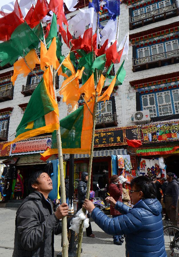 People purchase goods for the coming Tibetan losar or the Tibetan New Year at a bazaar in Lhasa, capital of southwest China's Tibet Autonomous Region, Feb. 18, 2014. People of the Tibetan ethnic group will embrace the "Wood Horse Losar" on March 2.(Xinhua/Liu Kun)