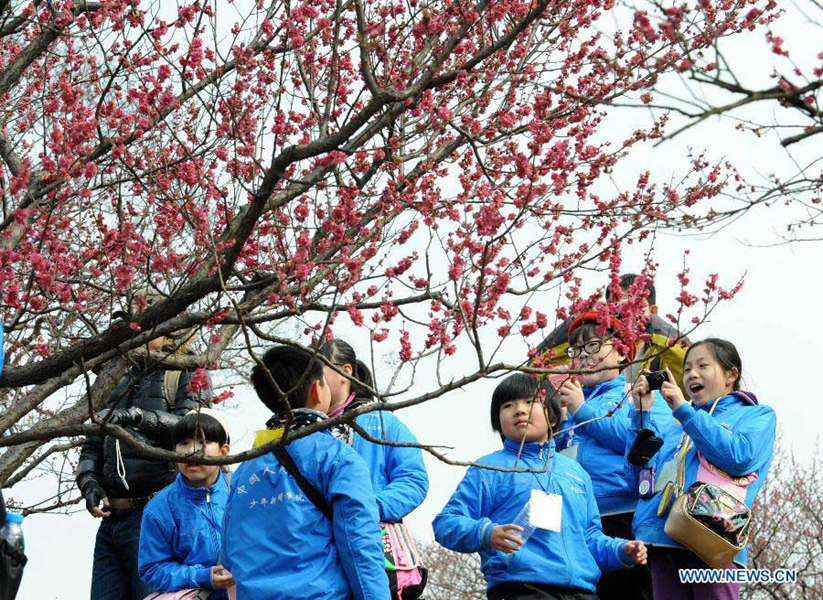 A student poses for photos during the 2014 Nanjing International Plum Blossom Festival in Nanjing, capital of east China's Jiangsu Province, Feb. 20, 2014. The 40-day festival opened here on Thursday. (Xinhua/Sun Can)
