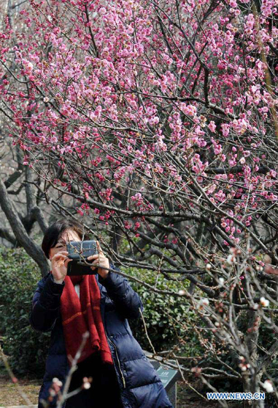 A visitor takes photos of plum blossom during the 2014 Nanjing International Plum Blossom Festival in Nanjing, capital of east China's Jiangsu Province, Feb. 20, 2014. The 40-day festival opened here on Thursday. (Xinhua/Sun Can)