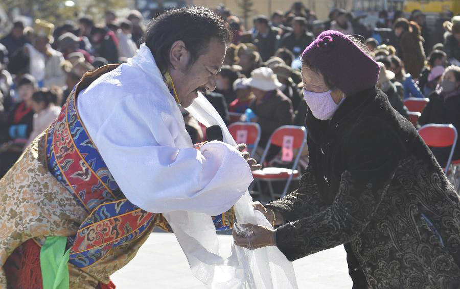 A villager offers khatag to an actor in Lhasa, capital of southwest China's Tibet Autonomous Region, Feb. 20, 2014. Local art troupes organized performances for villagers in Lhasa to embrace the upcoming Tibetan New Year. (Xinhua/Purbu Zhaxi)