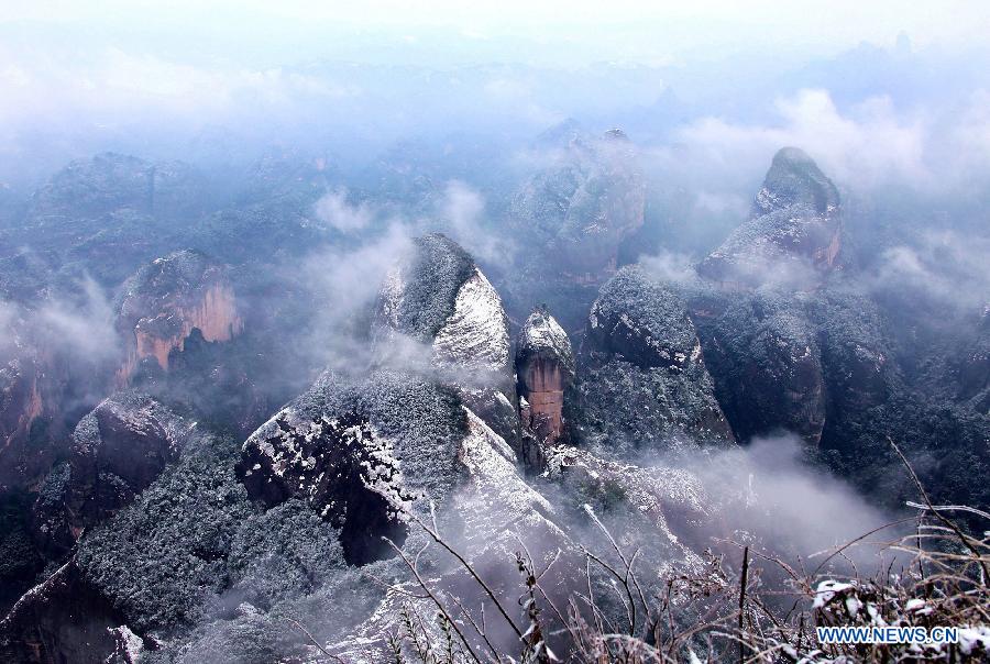 Photo taken on Feb. 19, 2014 shows the scenery of snow-covered Langshan Mountain in Ziyuan County, Guilin, south China's Guangxi Zhuang autonomous region. Langshan, featuring Danxia landform, witnessed a snowfall on Wednesday. [Xinhua/Pan Zhenhua]
