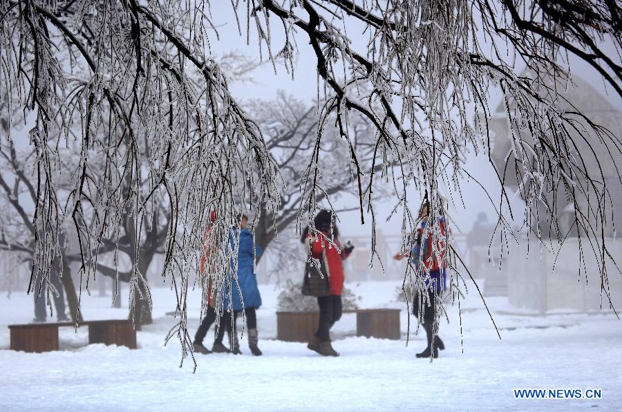Tourists enjoy the snow scenery in Lushan Mountain, east China's Jiangxi province, Feb. 19, 2014. Lushan witnessed continuous snowfall since the beginning of the spring this year. [Xinhua/Fu Jianbin]
