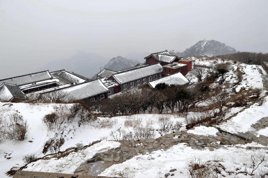 Photo taken on Feb. 19, 2014 shows the scenery of snow-covered Taishan Mountain in Tai'an, east China's Shandong province. Some areas of Taishan Mountain were covered by thick snow because of the continuous snowfall since mid February of 2014. [Xinhua/Xu Suhui]