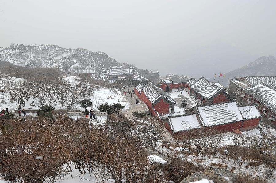 Photo taken on Feb. 19, 2014 shows the scenery of snow-covered Taishan Mountain in Tai'an, east China's Shandong province. Some areas of Taishan Mountain were covered by thick snow because of the continuous snowfall since mid February of 2014. [Xinhua/Xu Suhui]