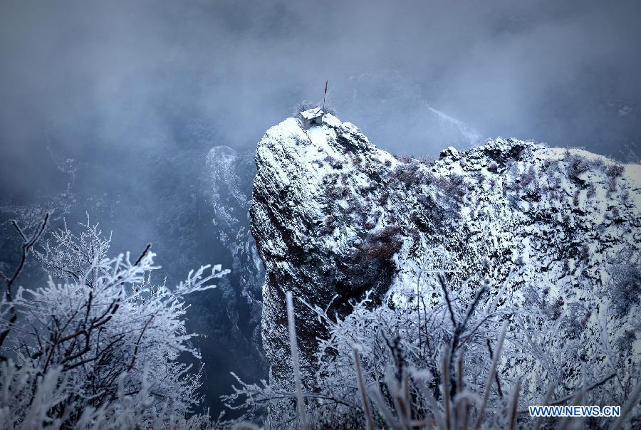 Photo taken on Feb. 19, 2014 shows the scenery of snow-covered Langshan Mountain in Ziyuan County, Guilin, south China's Guangxi Zhuang autonomous region. Langshan, featuring Danxia landform, witnessed a snowfall on Wednesday. [Xinhua/Pan Zhenhua]
