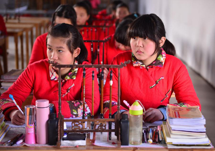 Students attend class at Yuzhang Academy in Nanchang, capital of east China's Jiangxi Province, Feb. 20, 2014. Yuzhang Academy was one of China's ancient academy of classical learnings and has a history of more than a thousand years. In 2011, the academy started anew to enroll students who are interested in traditional culture as well as those who are internet-addicted, weary of studying and any other juvenile who needs help, providing traditional curriculums including calligraphy, shadow boxing, tea ceremony, and etc. (Xinhua/Zhou Mi)