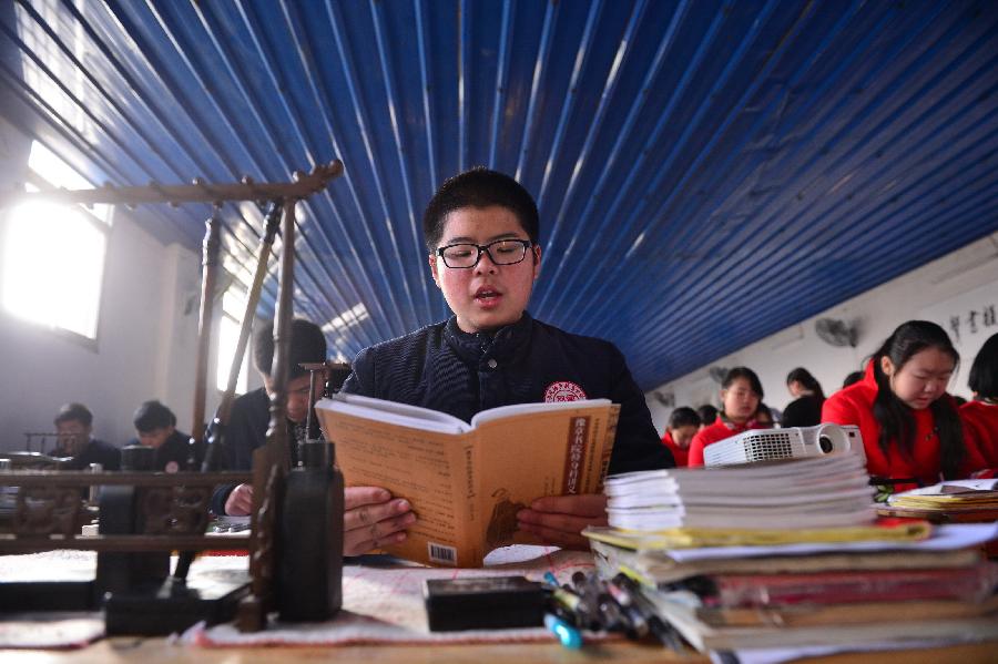A student recites Chinese classics at Yuzhang Academy in Nanchang, capital of east China's Jiangxi Province, Feb. 20, 2014. Yuzhang Academy was one of China's ancient academy of classical learnings and has a history of more than a thousand years. In 2011, the academy started anew to enroll students who are interested in traditional culture as well as those who are internet-addicted, weary of studying and any other juvenile who needs help, providing traditional curriculums including calligraphy, shadow boxing, tea ceremony, and etc. (Xinhua/Zhou Mi)