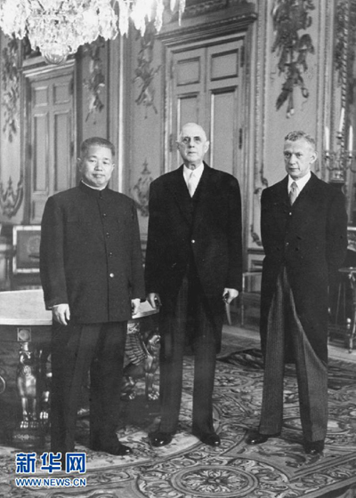 Huang Zhen (left), China's first ambassador to France presents his credential to French President Charles de Gaulle (middle), June 6, 1964. (Photo/Xinhua)