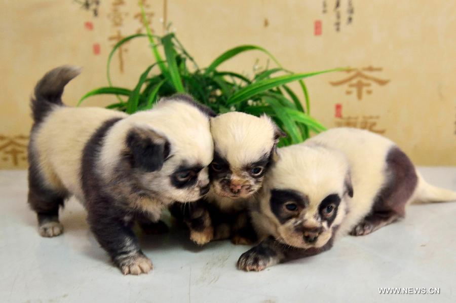 Photo taken on Feb. 22, 2014 shows three puppies looking like pandas in Yancheng City, east China's Jiangsu Province. A dog with dark fur gave birth to 6 puppies recently. Three of the puppies have black and white furs, making them look like giant pandas. (Xinhua/Jiang Xiaopeng)