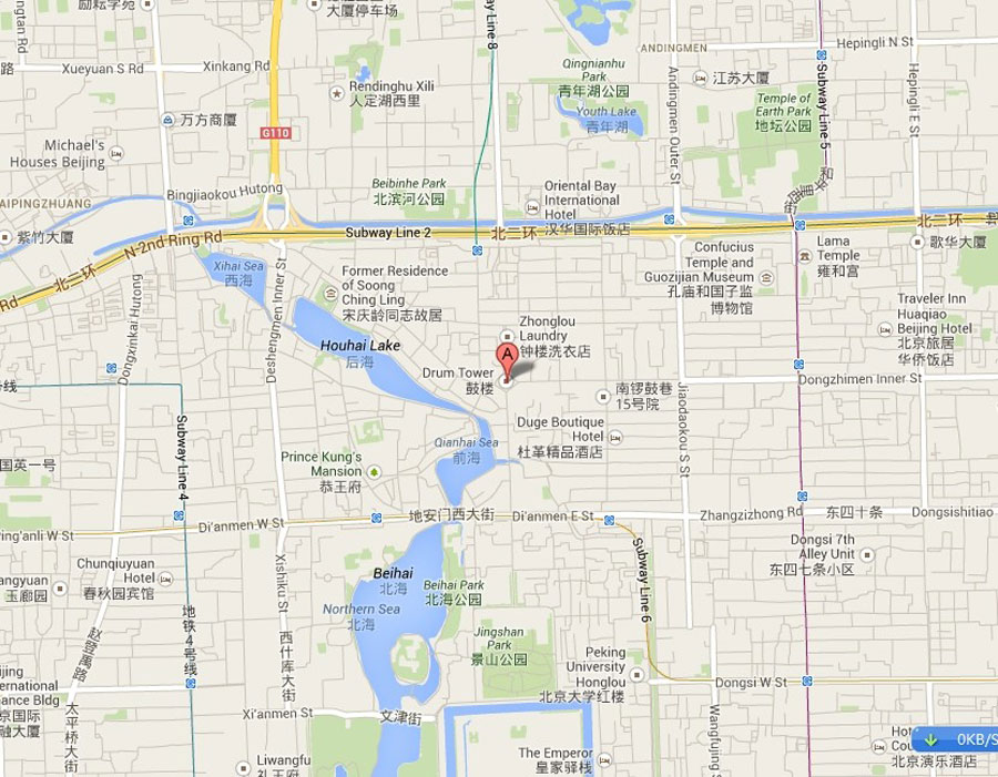 Location of Gulou, or the Drum Tower in Beijing. (Google Maps) |