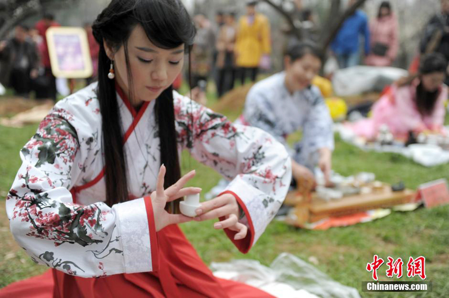 The tea specialists dressed in Han-style clothes present traditional Chinese tea ceremony to the public in East Lake Park in Wuhan, capital of central China's Hubei province, Feb. 23, 2013. (Photo/CNS)