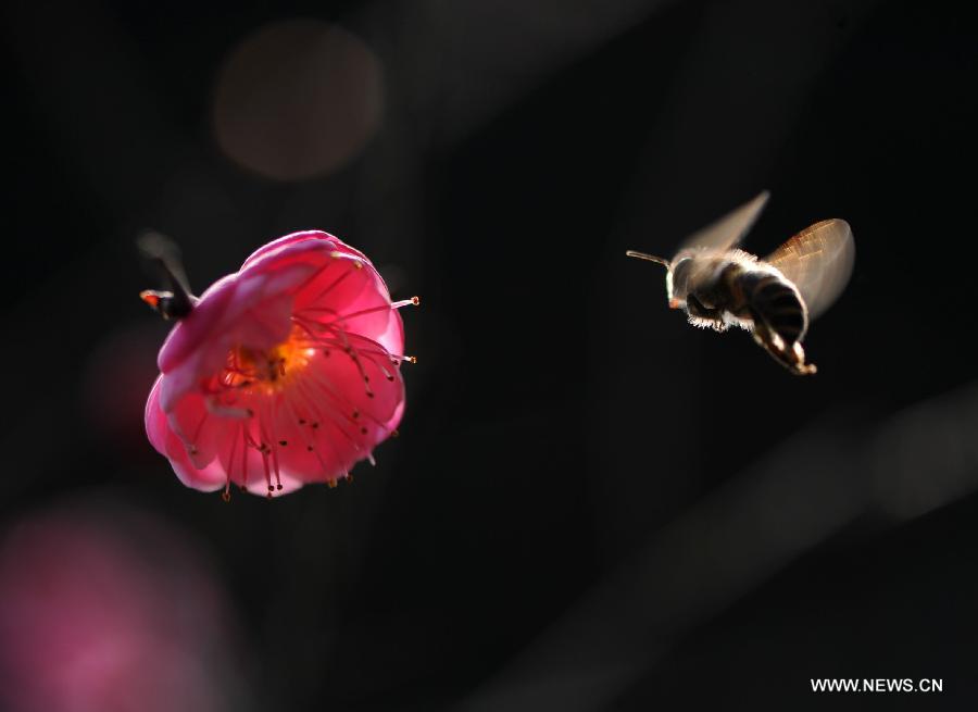 The file photo taken on Jan. 19, 2014 shows a bee collecting honey among plum flowers in Chengdu, capital of southwest China's Sichuan Province. The Chengdu Plain is a primary base for China's apiculture industry. Now this industry is in a bloom thanks to the warm winter in 2013. (Xinhua/Xiong Xiaoli)