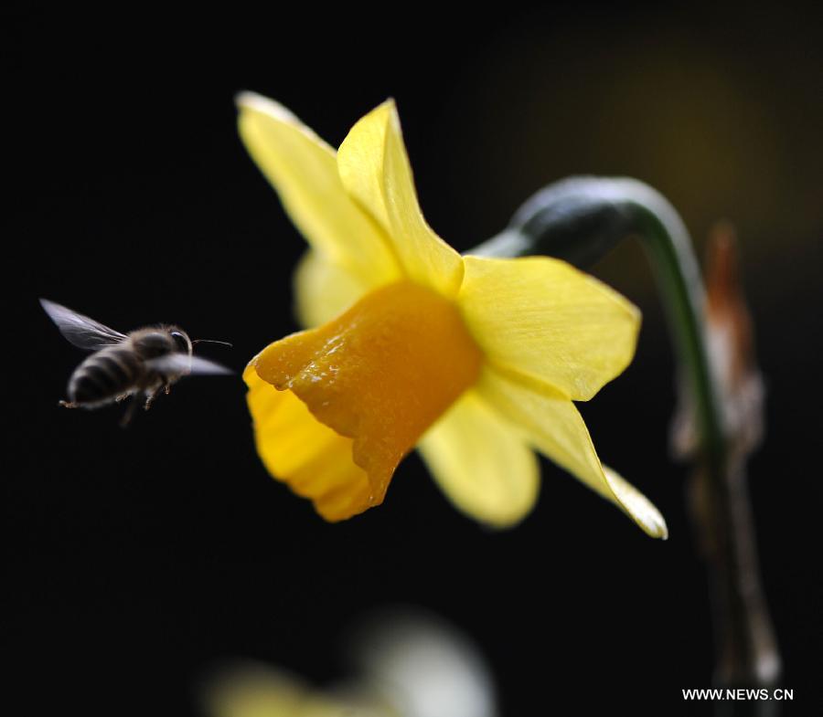 The file photo taken on Feb. 23, 2014 shows a bee collecting honey among daffodil flowers in Chengdu, capital of southwest China's Sichuan Province. The Chengdu Plain is a primary base for China's apiculture industry. Now this industry is in a bloom thanks to the warm winter in 2013. (Xinhua/Xiong Xiaoli)