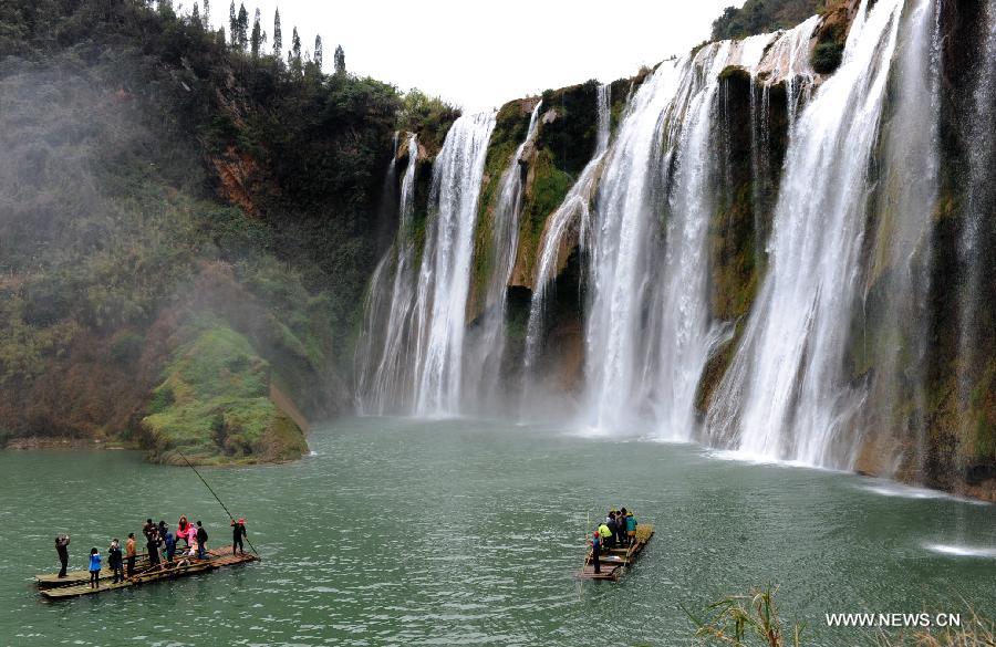 Tourists watch the Jiulong Waterfalls on bamboo boats in Luoping county, southwest China's Yunnan province, Feb. 23, 2014. Well-known for its cole flowers, Luoping county attracts a good many tourists and photographers in spring. (Xinhua/Chen Haining)