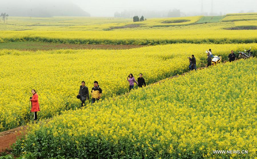 Tourists walk amid cole flowers in Luoping county, southwest China's Yunnan province, Feb. 23, 2014. Well-known for its cole flowers, Luoping county attracts a good many tourists and photographers in spring. (Xinhua/Chen Haining)