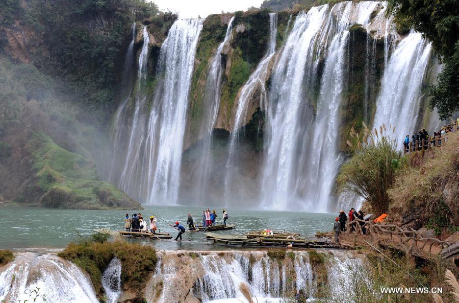 Tourists watch the Jiulong Waterfalls on bamboo boats in Luoping county, southwest China's Yunnan province, Feb. 23, 2014. Well-known for its cole flowers, Luoping county attracts a good many tourists and photographers in spring. (Xinhua/Chen Haining)