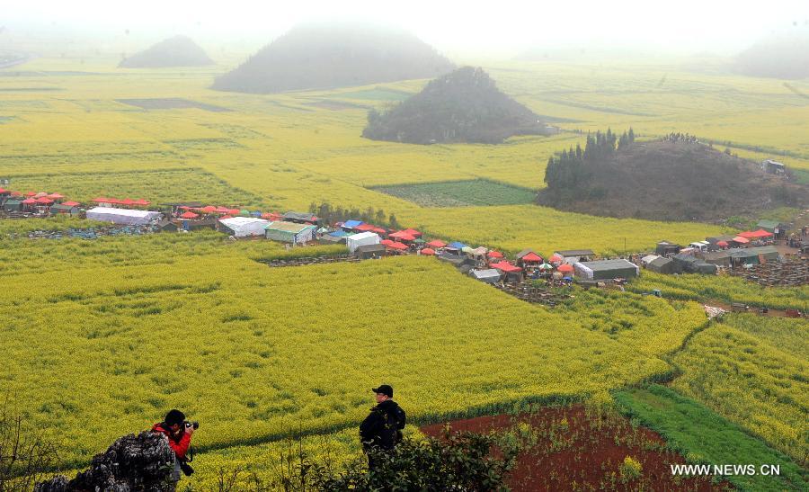 Amateur photographers take photos of cole flowers in Luoping county, southwest China's Yunnan province, Feb. 23, 2014. Well-known for its cole flowers, Luoping county attracts a good many tourists and photographers in spring. (Xinhua/Chen Haining)