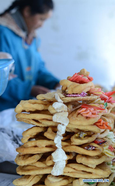 A dealer sells "Kasai," a traditional Tibetan food, to receive the coming Tibetan New Year, or "Losar", in Lhasa, capital of southwest China's Tibet Autonomous Region, Feb. 24, 2014. People of the Tibetan ethnic group will embrace the "Wood Horse Losar" on March 2. (Xinhua/Chogo)