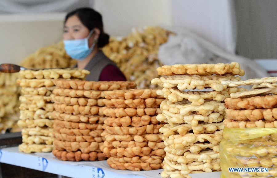A dealer sells "Kasai," a traditional Tibetan food, to receive the coming Tibetan New Year, or "Losar", in Lhasa, capital of southwest China's Tibet Autonomous Region, Feb. 24, 2014. People of the Tibetan ethnic group will embrace the "Wood Horse Losar" on March 2. (Xinhua/Chogo)