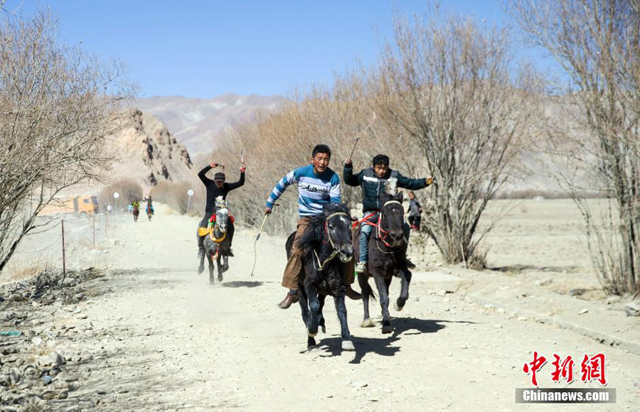 Villagers hold a horse racing competition to welcome the Tibetan New Year in Gyangze County in Tibet, Feb. 24, 2014. (Photo/CNS)