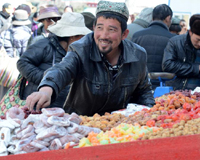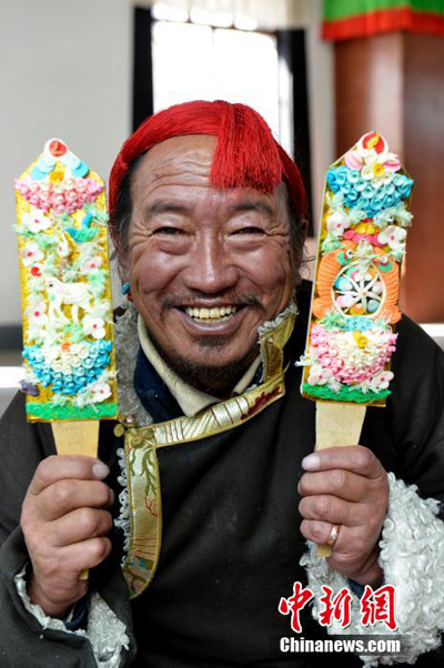 A vendor presents butter sculptures in a market in Lhasa, capital of Tibetan Autonomous Region on Feb. 24, 2014. (Photo/CNS)