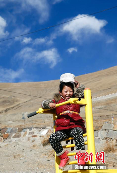 A girl plays on the exercise equipment in Langkazi County in Tibet, February 2014. (Photo/CNS)