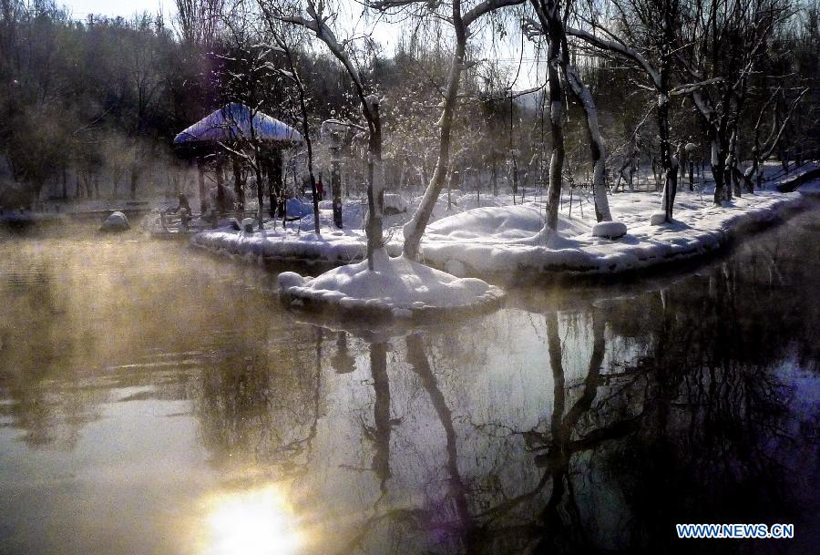 Hot spring water steams in Shuimogou Park in Urumqi, capital of northwest China's Xinjiang Uygur autonomous region, Feb. 25, 2014. The air became very fresh after a heavy snowfall in Urumqi on Tuesday. (Xinhua/Wang Fei)