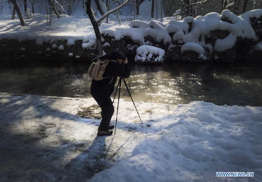 A photographer takes photo at Shuimogou Park in Urumqi, capital of northwest China's Xinjiang Uygur autonomous region, Feb. 25, 2014. The air became very fresh after a heavy snowfall in Urumqi on Tuesday. (Xinhua/Wang Fei)