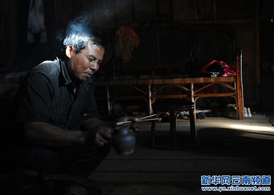 On the afternoon of January 10, an old Bulang man heats tea in his room. (Xinhua/Qin Lang)