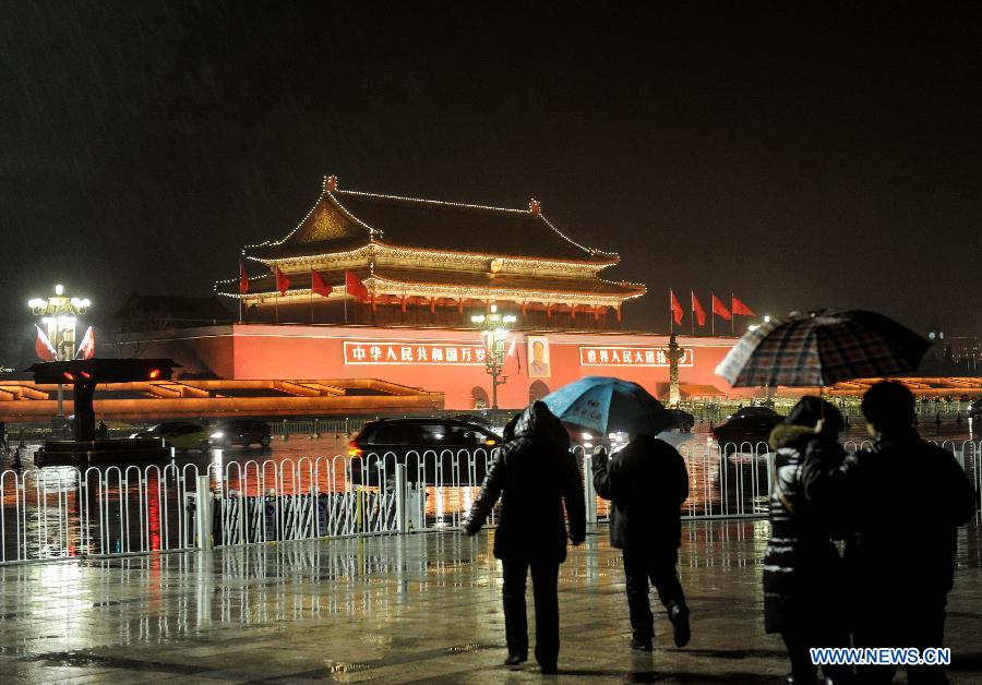 Tourists visit the Tian'anmen Gate in the rain in Beijing, capital of China, Feb. 26, 2014. Beijing saw its first rain this spring on Wednesday evening. The precipitation would be conducive to the city's air quality, which had been marred by a lingering smog. [Xinhua/Luo Xiaoguang]
