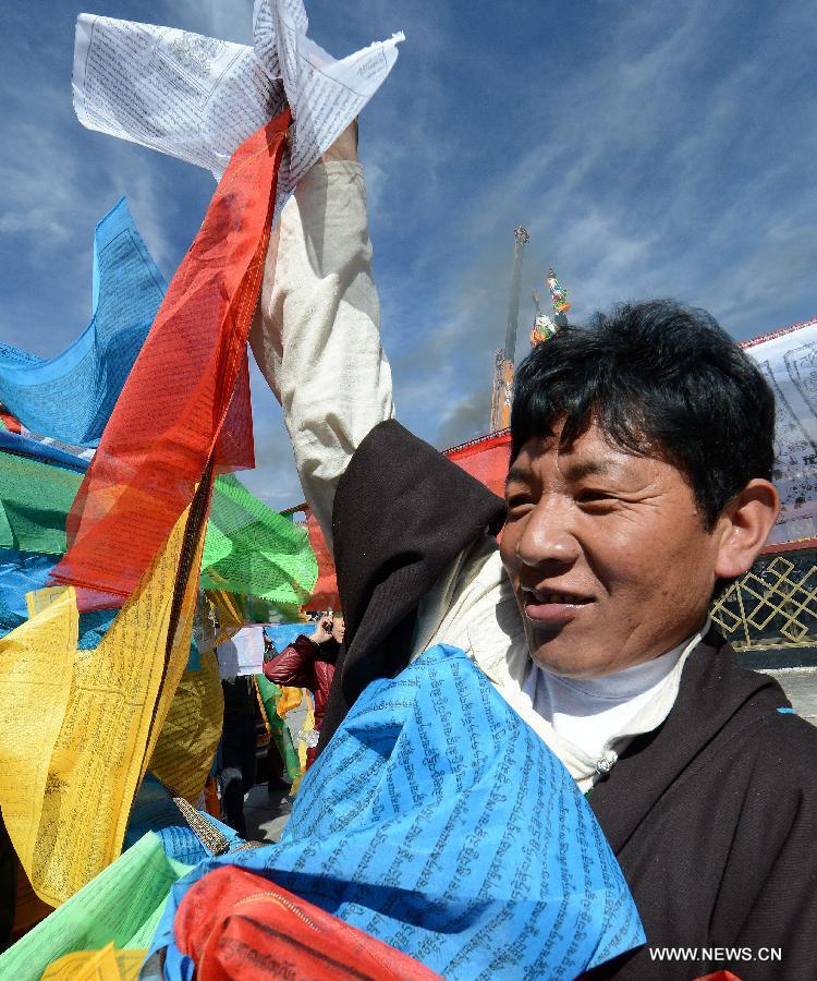 A Tibetan worshipper ties prayer flags to the pole at the prayer flag changing ceremony at Jokhang Temple in Lhasa, capital of southwest China's Tibet autonomous region, Feb. 26, 2014. The prayer flags tied to five long poles around Jokhang Temple were changed for new ones in Lhasa on Wednesday. Thousands of Tibetan Buddhism believers tied their prayer flags to the poles to pray for a prosperous new year. [Xinhua/Chogo]