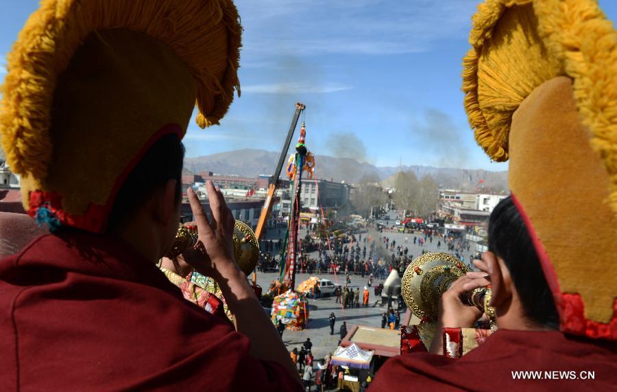 Monks play horn at the prayer flag changing ceremony at Jokhang Temple in Lhasa, capital of southwest China's Tibet autonomous region, Feb. 26, 2014. The prayer flags tied to five long poles around Jokhang Temple were changed for new ones in Lhasa on Wednesday. Thousands of Tibetan Buddhism believers tied their prayer flags to the poles to pray for a prosperous new year. [Xinhua/Chogo]